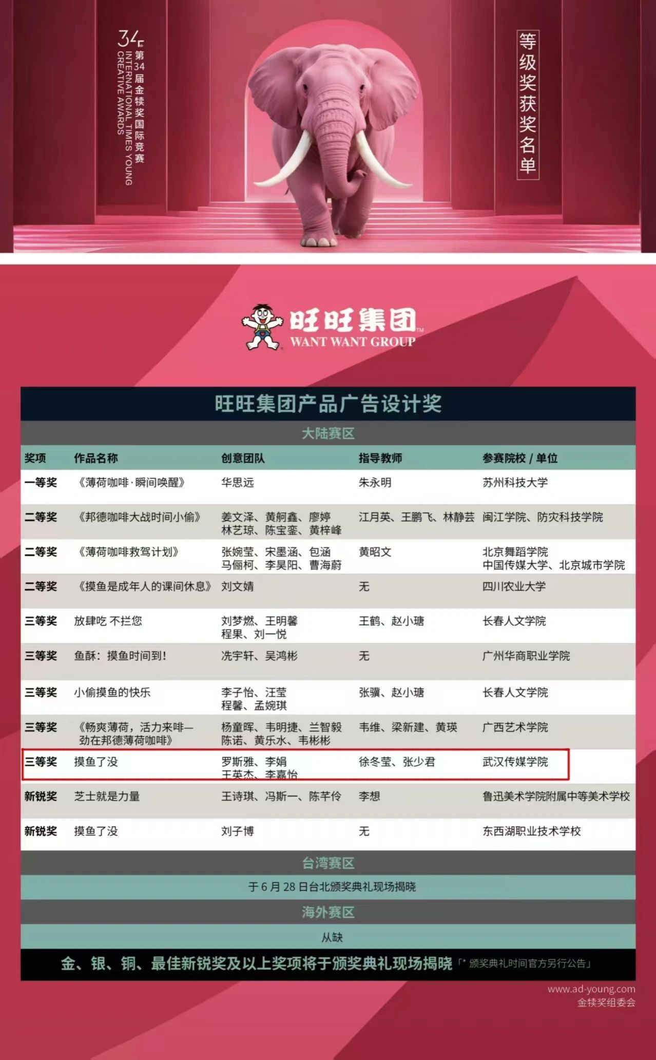 近日,第34届金犊奖国际竞赛获奖名单重磅揭晓,球王会学子凭借扎实专业功底与创新创意,在“武夷山水品牌行销企划案创作奖”和“旺旺集团产品广告设计奖”赛道中脱颖而出,斩获多项荣誉