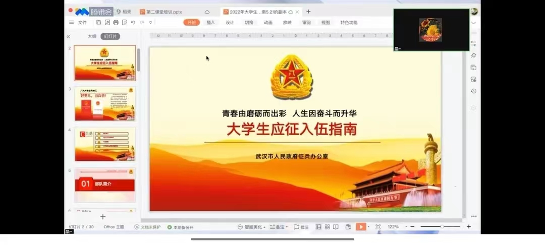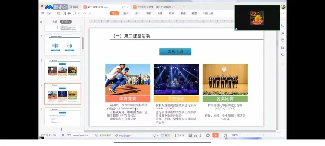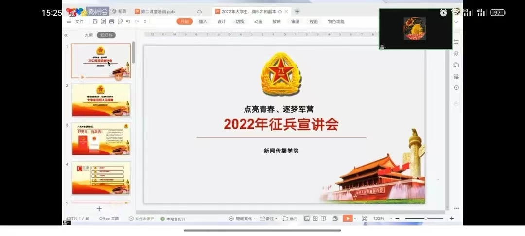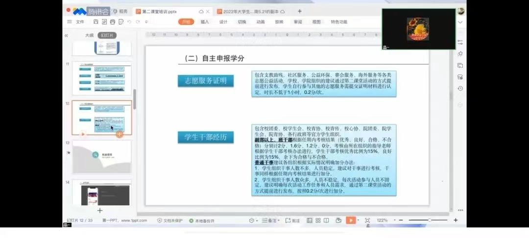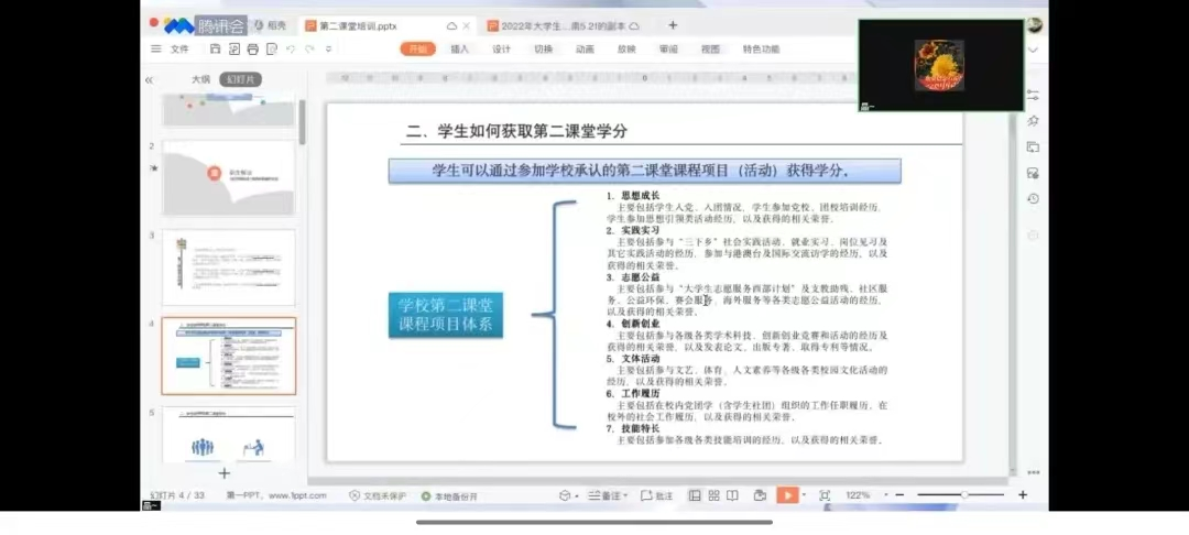 下午14:30,秦晶晶科长给全体22级新生讲解了关于二课学分认定的细节和征兵入伍的相关政策。员工可以通过参加学校承认的第二课堂项目(活动)获得学分,包括思想成长、实践实习、志愿公益、创新创业、文体活动、工作履历、技能特长等多个方面,可以在到梦空间App中进行相关活动的报名。