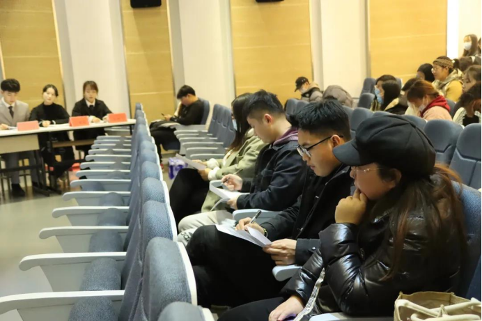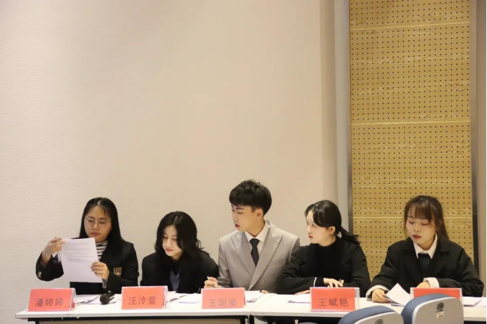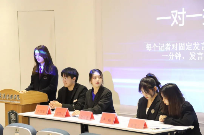 本次模拟新闻发布会决赛于2021年12月8在3101展开。比赛开始前主持人李嘉怡同学向我们介绍了本次活动的规则并公布了评委团,他们分别是员工科科长秦晶晶、马旻老师和王文琦老师.