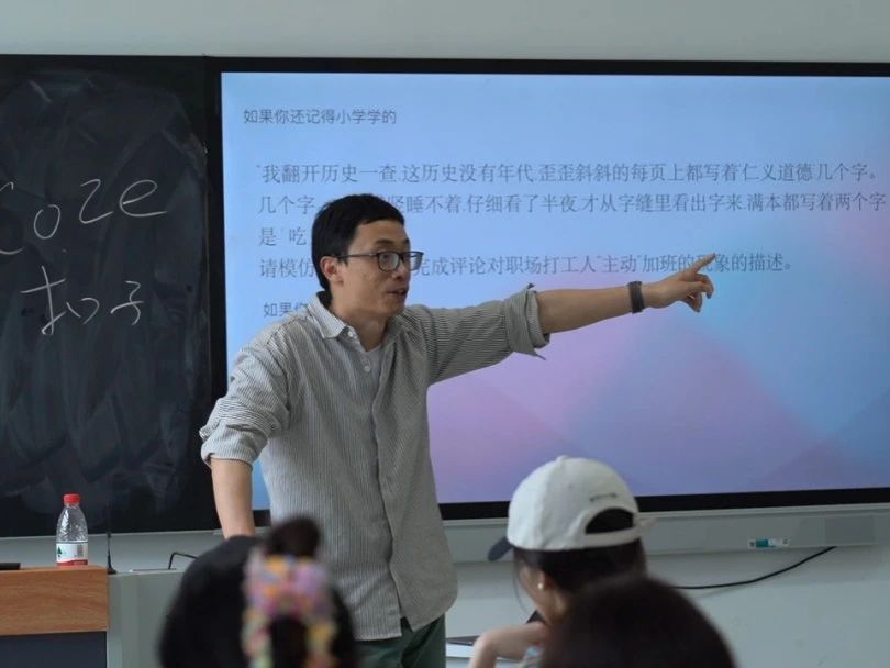 张少君老师先抛出一个问题,他让同学们通过模仿《狂人日记》里边关于「吃人」的文风,完成评论对职场打工人“主动”加班的现象的描述,瞬间吸引了同学们的注意力,活跃了现场气氛。