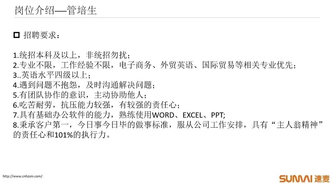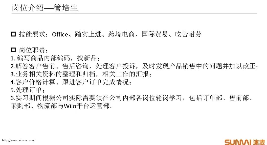 公司代表对公司的岗位职责和招聘要求也做了相应的介绍。岗位职责主要包括编写商品编码,并能快速找出商品;处理售前、售中、售后的相关事情;客户订单的处理;工作的及时汇报以及实习期相关的工作等。其中技能要求包括能熟练的掌握Office,了解国际贸易,跨境电商的相关知识等。并要求员工具有踏实上进,吃苦耐劳等优秀的精神品质。招聘要求也主要包括学历,英语能力和平常的办事能力,心态问题和电脑办公的相关技术能力等。