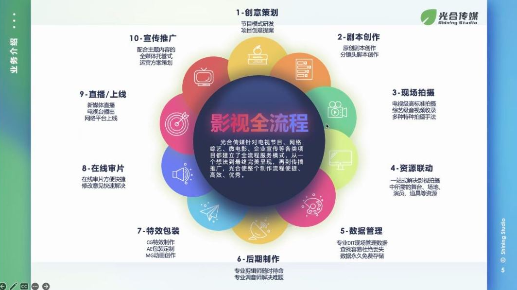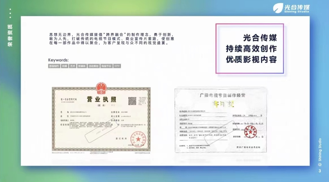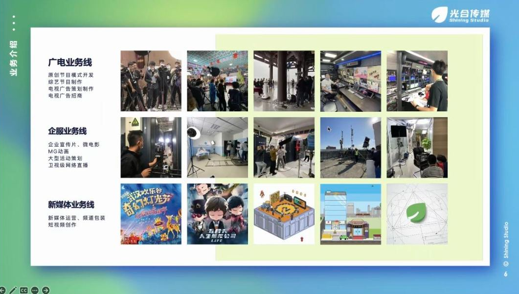 公司的业务分为三大板块,分别为广电业务线、企业服务业务线和新媒体业务线。广电业务线的主要负责原创节目模式开发、综艺节目制作、电视广告策划制作与电视广告招商。光合传媒主营业务是影视内容生产:在此方面,光合传媒有专业的电视节目制作机构和原创影视内容策划制作经验。企服业务线负责企业宣传片和微电影、定制栏目、动态视觉、MG动画、 大型活动策划与卫视级网络直播;新媒体业务线工作内容包括新媒体运营、频道包装短视频创作。公司有完备的在线审片协作系统,即使疫情期间也能实现异地高效沟通。