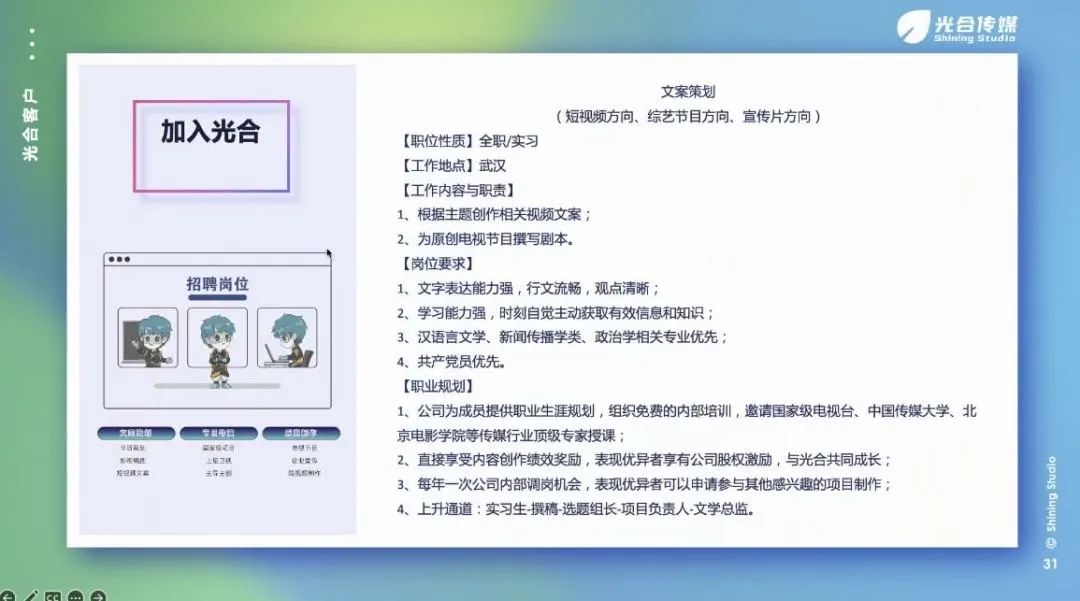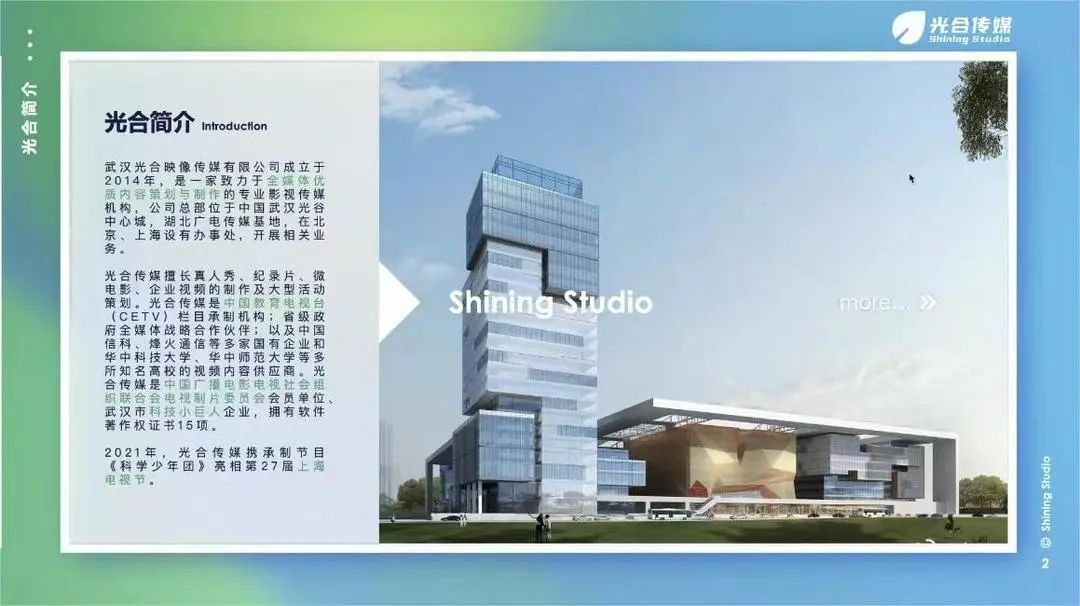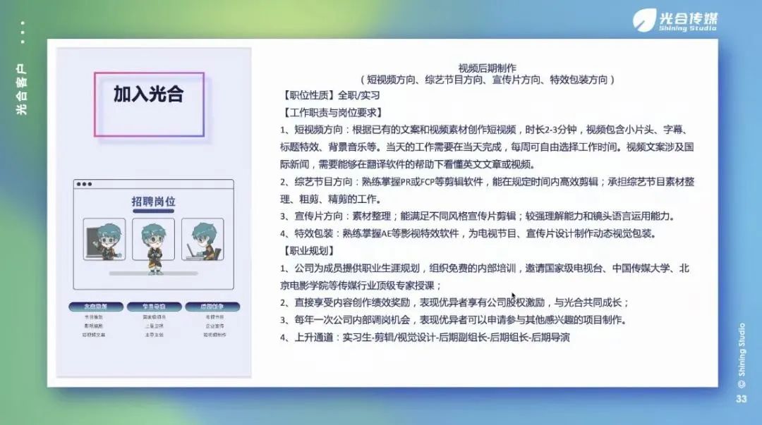 为持续跟进公司应届毕业生就业工作、拓宽毕业生发展渠道、减缓员工就业压力,球王会于2022年11月18日下午15时召开了2023届毕业生-光合映像专场宣讲会。本次会议由公司代表顾炜栋先生主讲。01、企业介绍