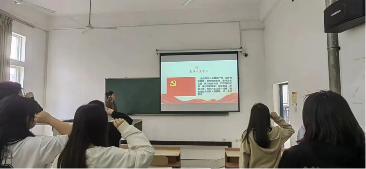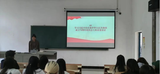 会议开始,全体起立奏唱国歌,重温入党誓词。接着张蓉同志带领同志们学习习近平在庆祝中华人民共和国成立74周年招待会上的重要讲话,习近平总书记重要文章《扎实推动教育强国建设》等。