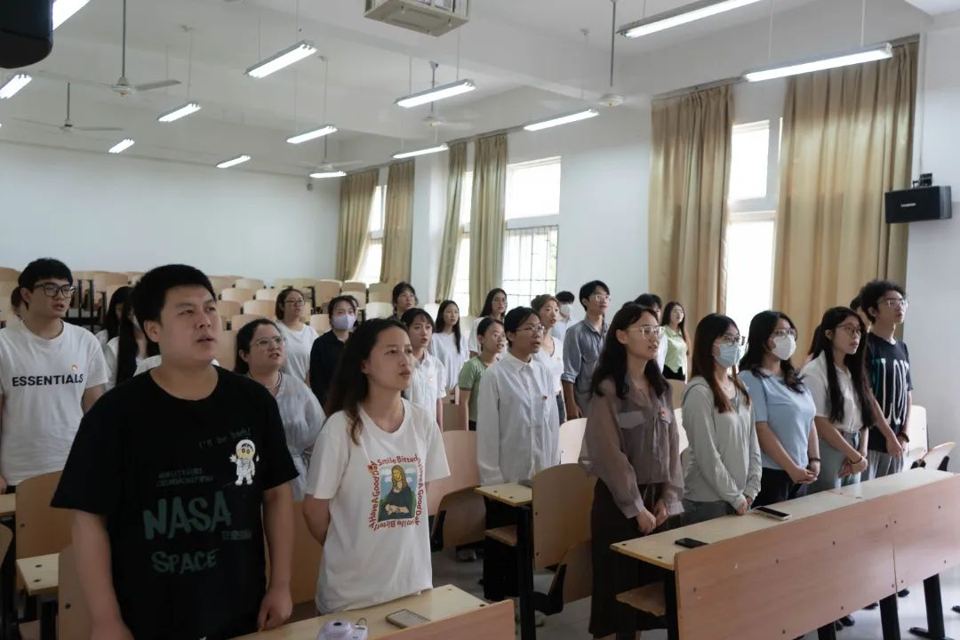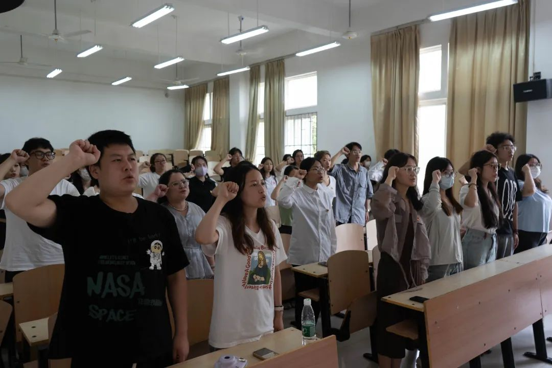 党课开始,全体成员起立,庄严奏唱国歌。唱毕,由蒋宇杰同志领誓,带领全体毕业生党员重温入党誓词,铿锵有力的宣誓声表达了同志们在为民族复兴的赛道上奋勇争先的决心。宣誓完毕,蒋宇杰同志希望同志们能够通过重温入党誓词进一步坚定理想信念和党员宗旨。