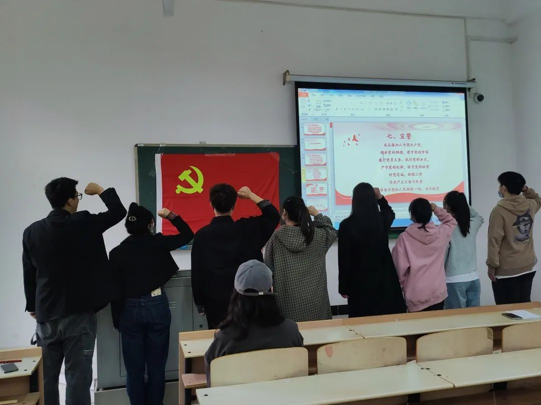 随后,由黑思博同志主持召开了预备党员宣誓仪式,入党介绍人为刚成为预备党员的同志佩戴党员徽章。随后,黑思博同志及入党介绍人带领六名同志面向党旗进行庄严的入党宣誓。