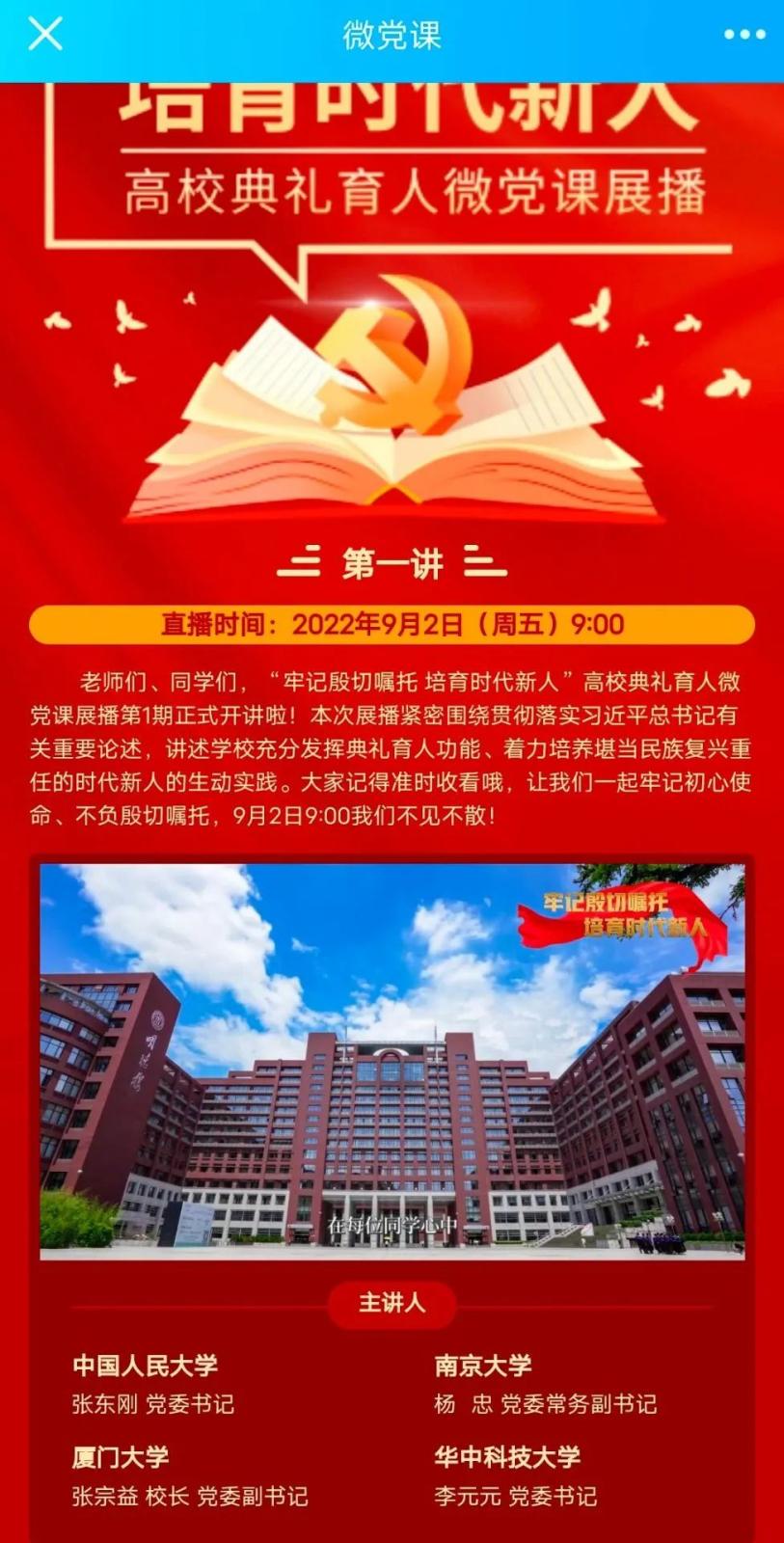 2022年9月2日上午9:00,由教育部思想政治工作司指导,新华网、全国高校思政网承办,新华网、人民网、学习强国、微言教育、全国高校思政网、中国老员工在线、易班网联合播出的“‘牢记殷切嘱托 培育时代新人’高校典礼育人微党课第1期”播出。