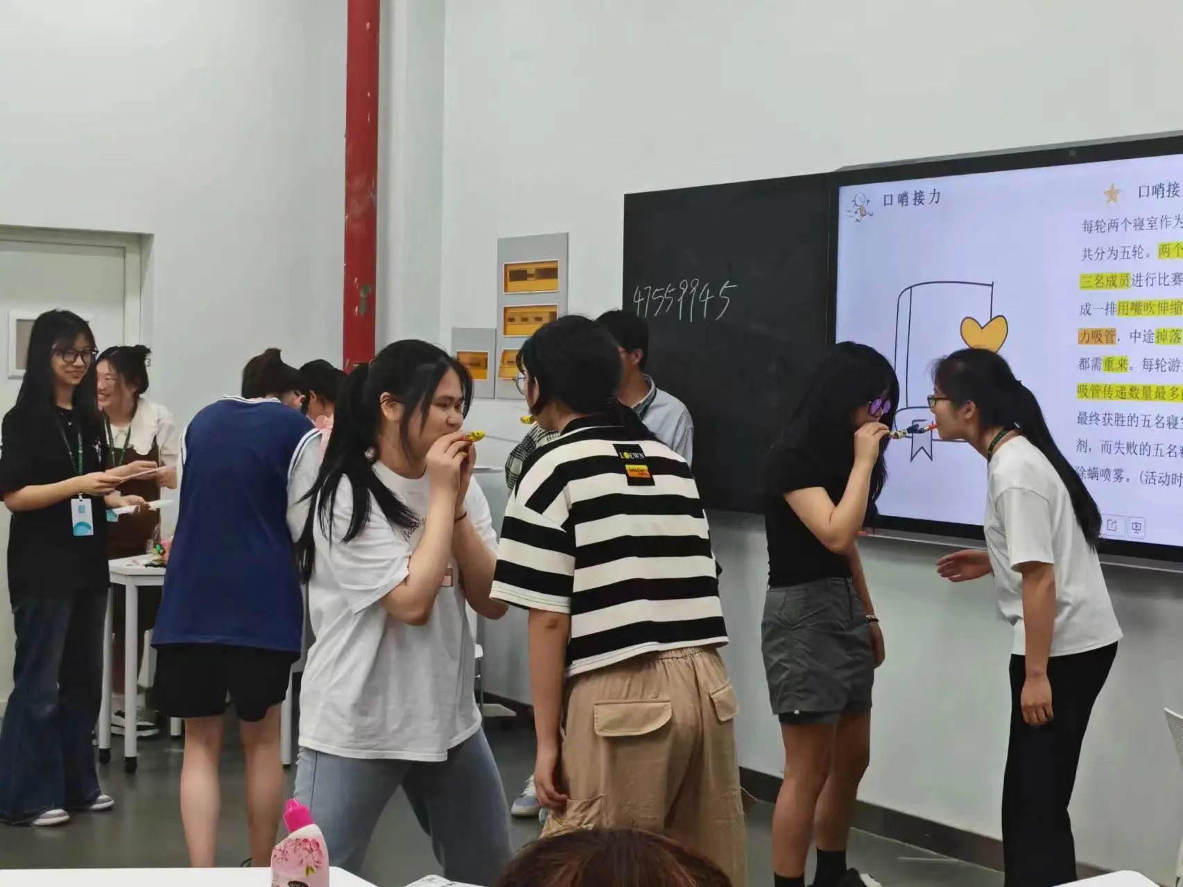 “口哨接力”游戏则是一个考验成员间传递信息准确性和速度的游戏。游戏要求寝室成员成员站成一排用嘴吹伸缩口哨吹吹卷接力吸管,中途掉落或者用手触碰都需重来。这个游戏让同学们认识到,信息传递对于团队合作至关重要。在团队中,每个人都是信息传递的节点,只有确保信息的准确传达,才能保证团队目标的顺利实现。