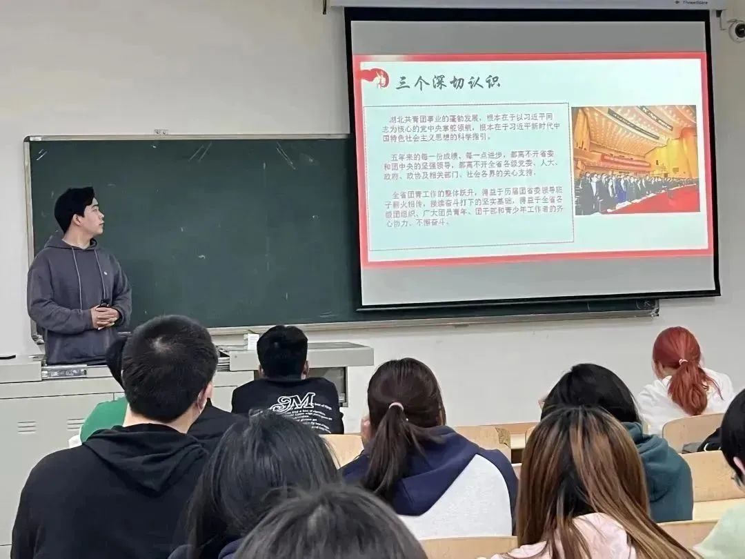 团课开始,主讲人李鹏辉向我们详细地讲述了共青团湖北省第十五次代表大会的相关事项,并鼓励同学们能听党话跟党走,不负青春、不负韶华、不负时代,砥砺奋进,用实际行动践行青年一代的责任担当,向着中华民族伟大复兴的宏伟目标奋勇前进。