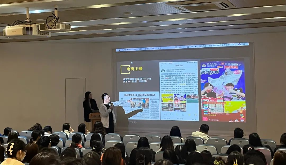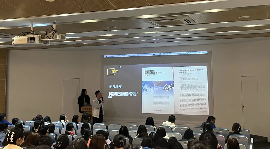 宣讲会的最后一个环节,一级播音员(中级职称)、武汉大学新闻学硕士、湖北经视主持人、湖北经视人才招聘节目《博得offer》主播孙志博老师作为校外实习单位代表为同学们进行宣讲。他分别讲了自己在传媒、新媒体、校园三方面的杰出成果,并针对介绍了个人团队特色、高校探访类融媒体节目《博哥庆姐探专业》,通过主持人深入探访校园、特色专业、重点实验室等。