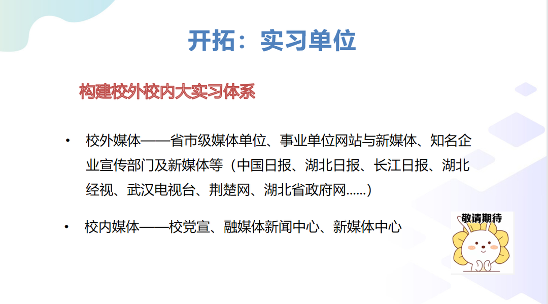 在本次宣讲会上,员工代表周宇、马彩云、赵一聪、龚丽娟、周丽婷分享自己在实习途中的心得与感悟。他们详细地讲述了自己的工作内容、制作输出作品和在实践中的收获。他们指出,通过此次大实习活动,为自己增加机会、增加校外实习经历,让自己从课本迈向真正的实践中。“千川汇海阔,风好正扬帆。”去年大实习代表——龚丽娟同学对于这段收获颇丰,意义重大的实习经历分享了她的心得感悟。作为湖北广播电视台教育频道新媒体运营岗位的一位工作人员,她每天的工作内容包括短视频拍摄、新闻选题策划、每日热点追踪、视频审发、脚本策划等等。龚丽娟同学表示,尽管工作内容十分繁琐,但所学皆可灵活运用于实践工作的感觉实在是大为满足。于是她也取得了:多个视频播放量破百万、登上微博热搜、协作共同运营官方抖音号,实现涨粉20万+的佳绩。为在座各位展现了一段丰富多彩的实习生活,也激励着同学们在未来去拥抱无限可能。此外,他指出节目现场和学院实验室地点灵活、更省时间,实习工作可以一次搞定。