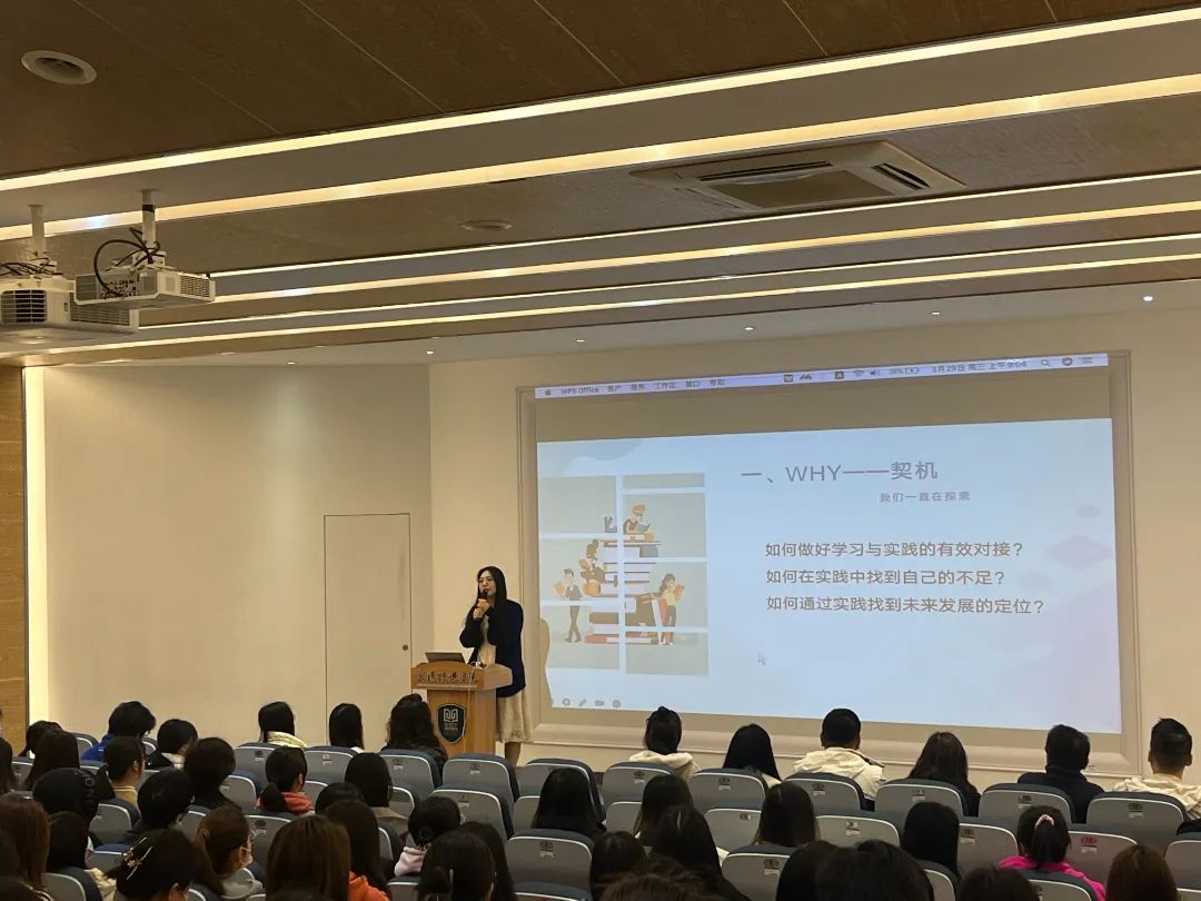 在各位新小传们进入大三下学期的课程后就会更加切身体验这个项目的具体流程,在学院带领下实现“课程——实习——就业”的有效联动。紧接着,杨郡媚老师也对在座的参会员工进行了问卷调查的互动,对于“心仪的校外岗位”、”对于校外岗位的志向”等进行大致的了解。在实习老师们提出对于大实习流程的注意事项后,我们也迎来了此次会议的下一个环节——实习代表的心得分享。