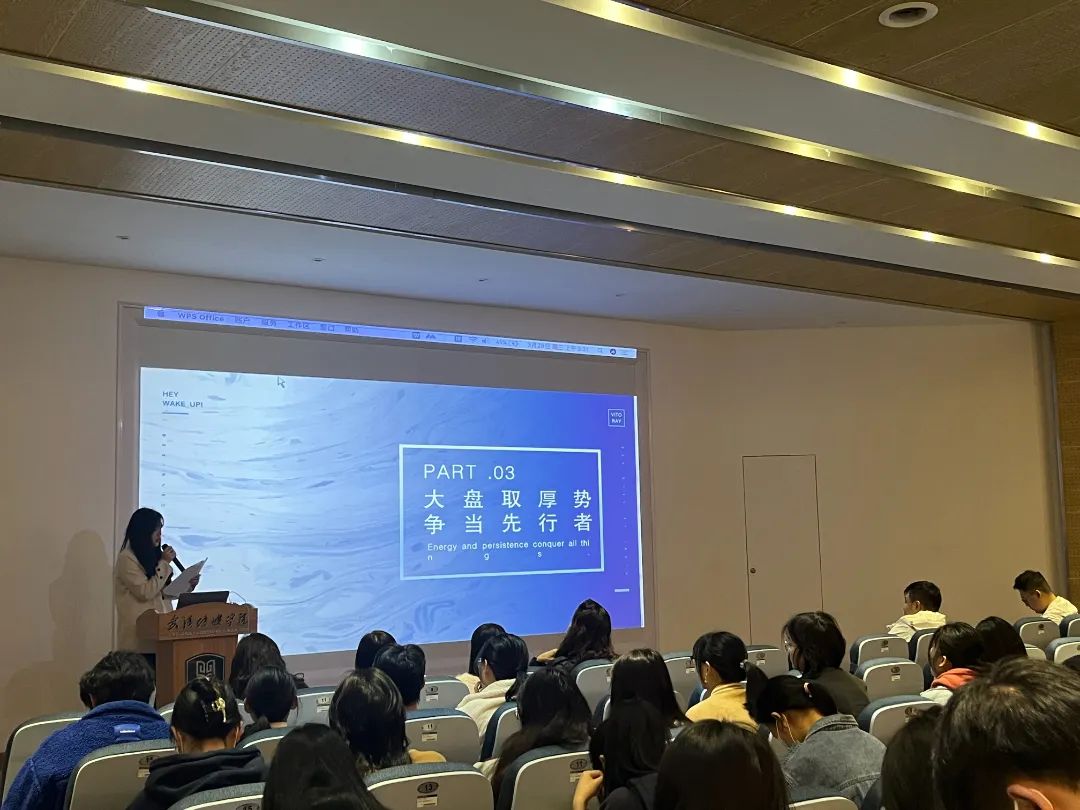 宣讲人汪忠老师在轻松愉悦的氛围中讲述了自己在中国传媒大学就读期间的一些有趣的事,并介绍了武汉玩有影力影视传媒有限公司的四大业务板块:景区整合营销服务、文旅政务推广服务、网络达人经纪服务和直播带货团购服务。最后,他希望可以营造一个轻松愉悦的氛围,使同学们长久的保持对专业的热爱,在实践探索中成长。“时代舞台广阔,青年大有可为”。希望向同学们通过此次宣讲能有所收获,在成长的道路上不断充实自己,做到学有所思、思有所悟、悟有所行,在时代大潮中找到自己的坐标,在不懈奋斗中尽到自己的责任。