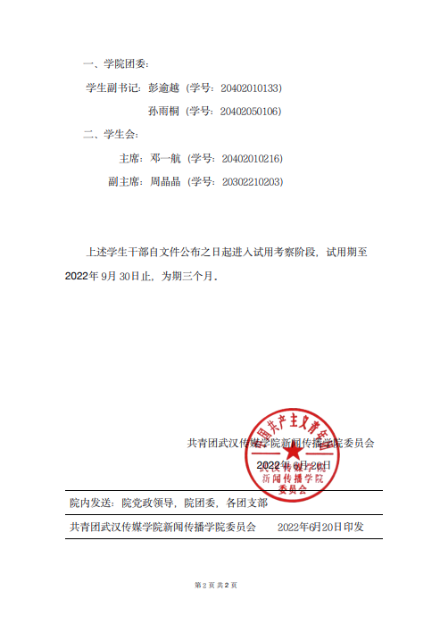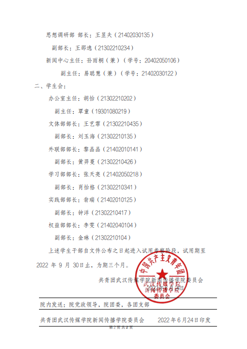 新闻中心主任:孙雨桐(兼)、新闻中心副主任:易聪慧(兼)
