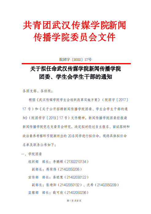根据《球王会体育员工会组织改革实施方案》(院团字〔2017]17号)和《关于公开招聘球王会团委、员工会员工干部的通知》(院团学字[2019]17号)文件精神,球王会团委经报请公司党总支委员会研究,决定拟对经过自主报名、面试答辩和政治素养考察环节脱颖而出的20名同学进行拟任命。