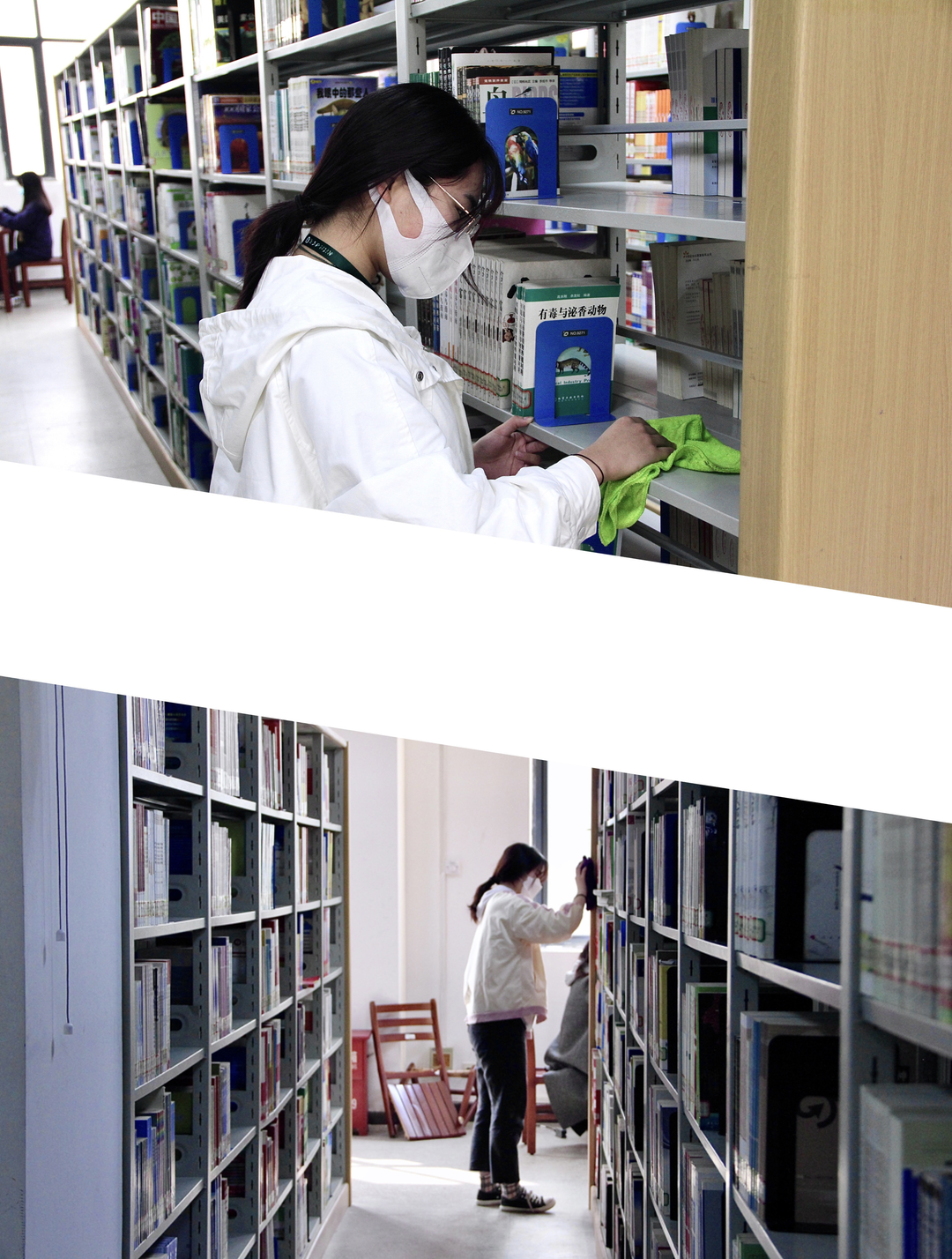 在清理过程中,志愿者们放慢脚步,轻言轻语,放轻动作,尽可能减小动作幅度与声音,保持安静,避免打扰同学们学习。志愿者们时而踮起脚尖,时而蹲下身子,不停擦拭书架,同时也不忘收拾未摆放好的书籍,将书籍沿书架边缘摆放整齐,便于后来的同学寻找。有条不紊地地将书架空余部分、角落空隙、顶部仔细擦拭,不放过每一个缝隙,不放过每一个角落,有秩序地轮流清洗抹布。