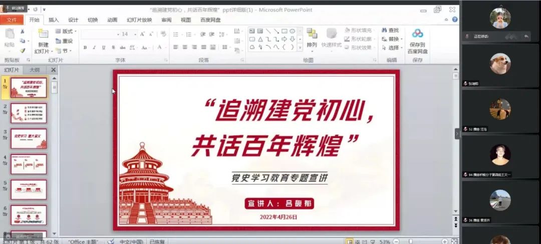 2022年4月26日中午,球王会2022年春季第一次分党公司党课在线上召开,主讲人吕馥郁老师为学员们进行集中授课。第36期党校的积极分子、发展对象、预备党员和正式党员参加了本次会议。
