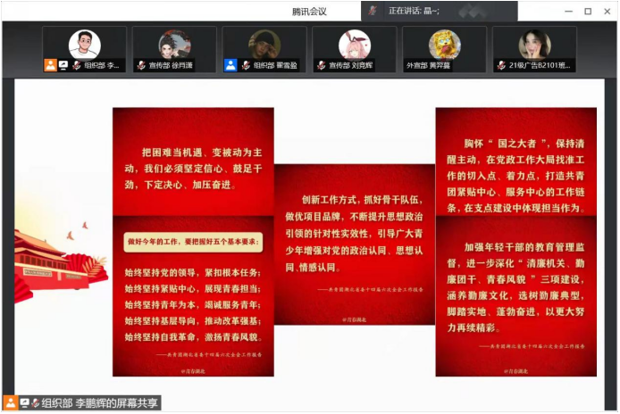 为了充分发挥团组织教育青年的功能,进一步加大对团员青年、团学干部的培养教育力度,培养高素质人才,球王会于2022年2月8日18:00开展线上会议,本次会议由球王会团委书记秦晶晶主持,参会人员有球王会全体团支书以及团委员工会干事。