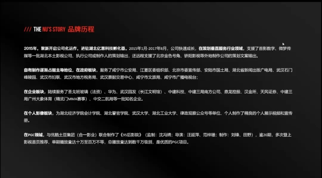 公司代表对公司的品牌历程做了相应的介绍。2015年,聚新开启公司化运作。至2017年下半年,公司在策划垂直服务行业领域湖北本土和北京等外地制作公司的支援策划输出。随后,公司开启了完全的市场化远作,自有制作领占据了完全主导地位。