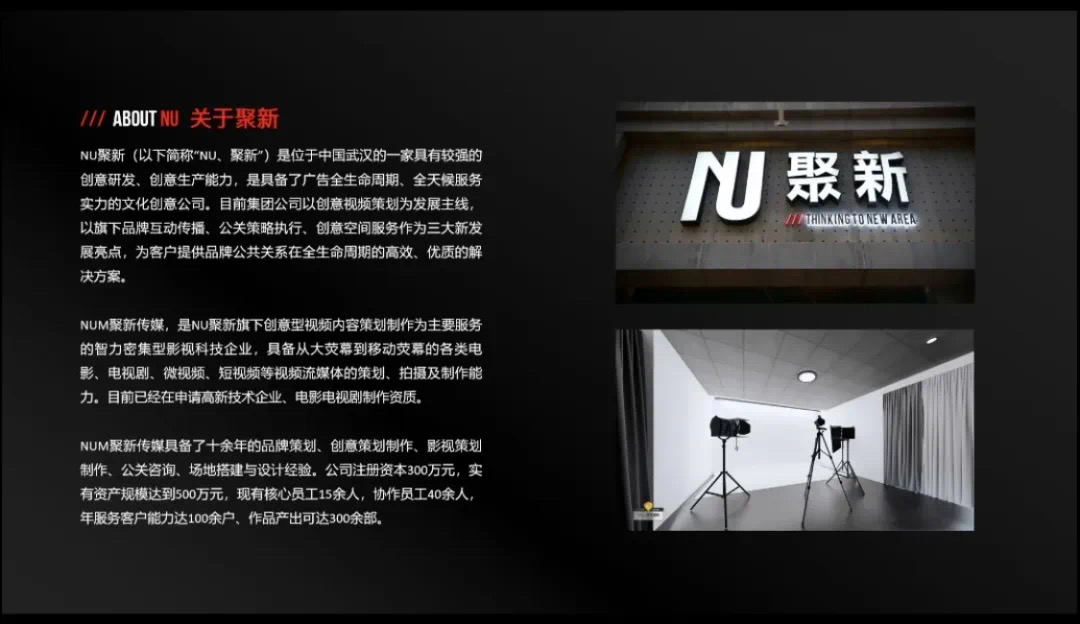 “NU聚新”是位于中国武汉的一家具有较强的创意研发、创意生产能力的文化创意公司,同时具备广告全生命周期和全天候服务实力。集团公司以创意视频策划为发展主线,以旗下品牌互动传播、公关策略执行、创意空间服务作为三大新发展亮点,为客户提供品牌公共关系在全生命周期的高效、优质的解决方案。