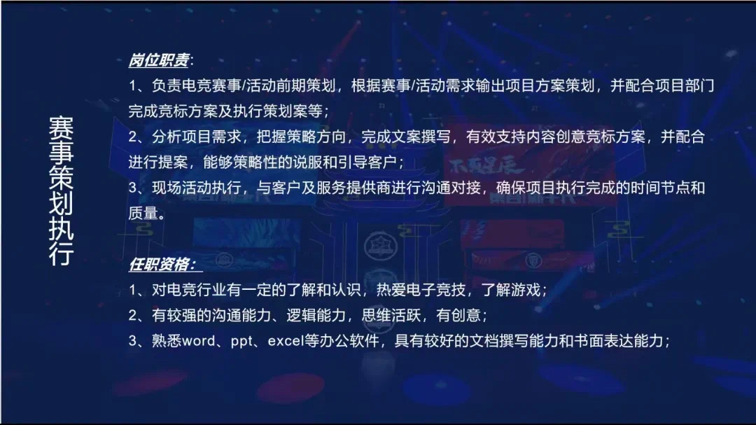 首先活动类的岗位是电竞赛事策划执行,需要负责电竞赛事前期策划、分析项目需求、现场活动执行。要求对电竞有一定的了解;有较强的沟通能力、逻辑能力,思维活跃;需要熟悉word、ppt、excel等办公软件,具有较好的文档撰写能力和书面表达能力等要求。