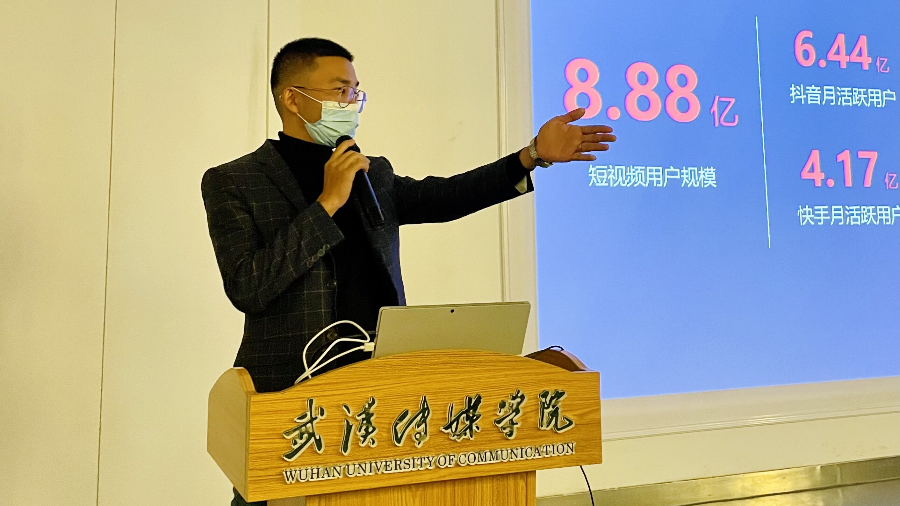 在会上,安华飞老师给同学们讲解了短视频的趋势,他提到:“短视频app的兴起让内容创作的门槛得到了进一步的降低;从长远来看,优质的内容将成为短视频的核心竞争力”。